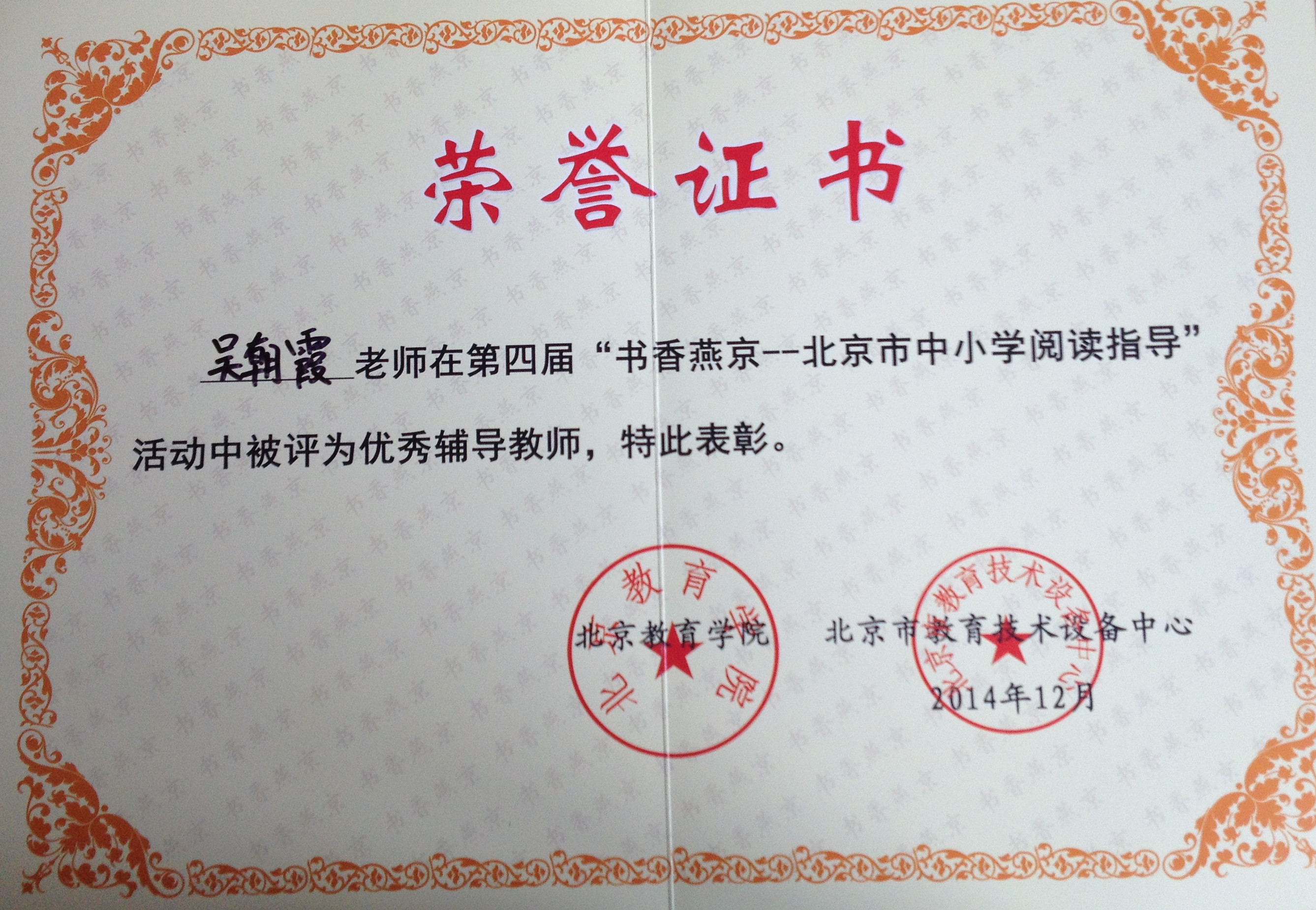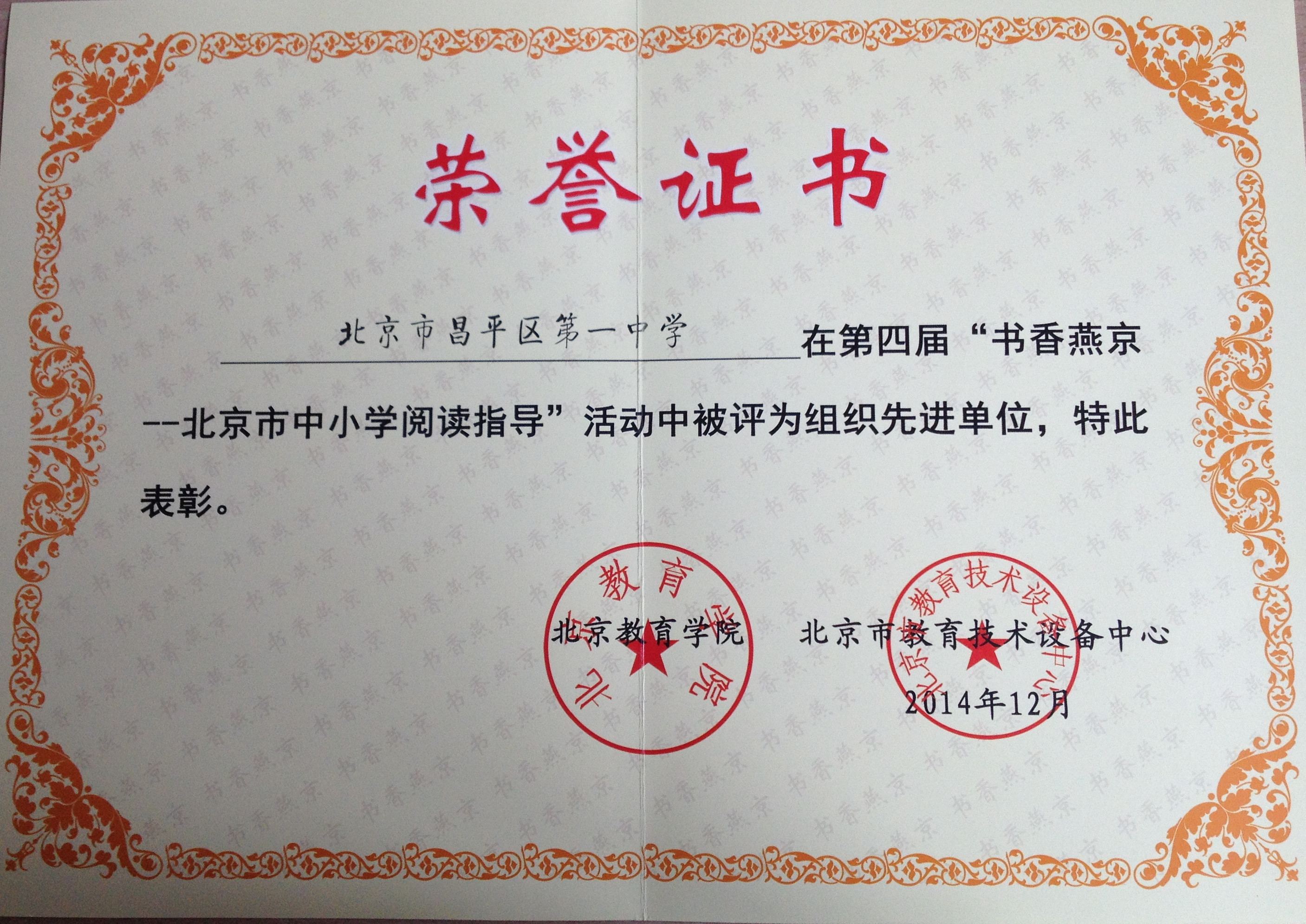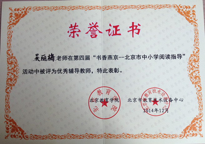 在北京市第四届“书香燕京”征文活动中,昌平一中被评为“北京市中小学阅读指导活动组织先进单位”,吴丽梅老师、高宝香老师被评为“先进组织工作者”,吴丽梅老师、吴朝霞老师被评为“北京市中小学阅读指导活动优秀辅导教师”。本次征文活动中,共有36篇征文分别获一、二、三等奖。其中杜茂莉老师、鲁红梅老师获得教师组征文一等奖;高二(1)班杨默凡同学、高三(1)班的田思琦、李祎然同学获高中组征文一等奖。杨默凡同学的《我爱地球》、田思琦同学的《我有一个消逝的梦》、李祎然同学的《我们的岁月》被收录在《第四届“书香燕京”——北京市中小学生阅读指导活动优秀征文选编》一书中。